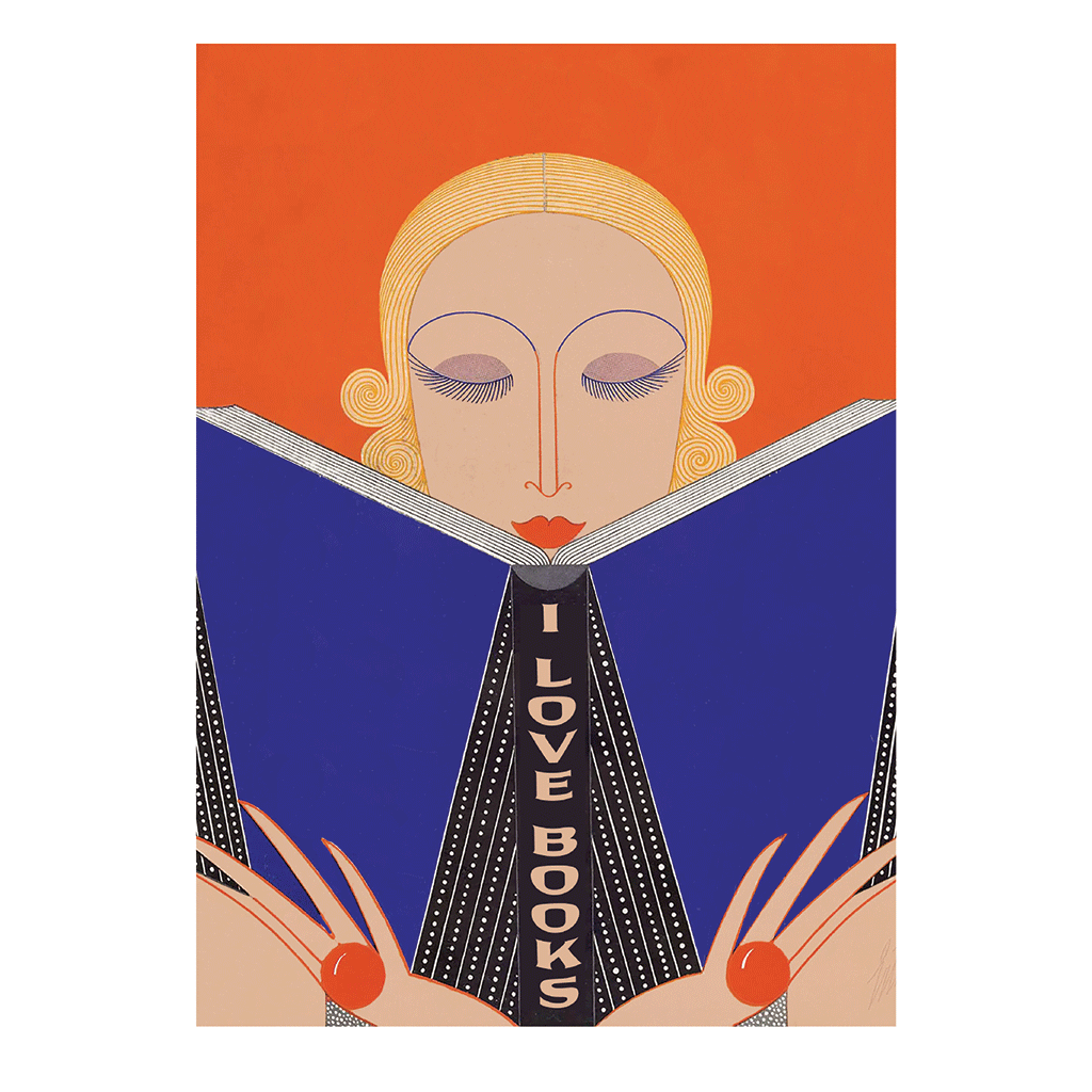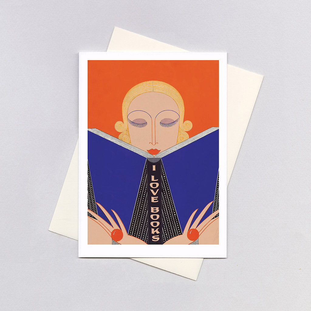 This stunning card showcases the unmistakable Art Deco elegance of Erté, featuring a stylish blonde beauty lost in her book. With her dramatic long lashes and the book's spine declaring "I LOVE BOOKS," she embodies the pure joy of reading with characteristic Erté sophistication.
