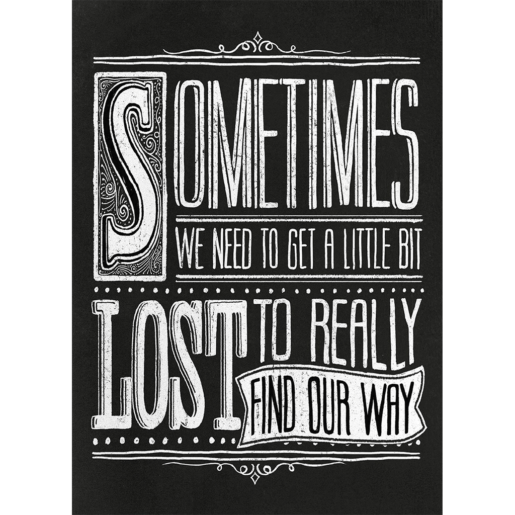This graphic black and white card delivers a profound truth about life's unexpected detours. Featuring the contemplative message "Sometimes We Need to Get a Little Bit Lost to Really Find Our Way," it transforms philosophical wisdom into striking visual art. The bold and straightforward design creates a dramatic contrast that emphasizes both the message and its meaning.