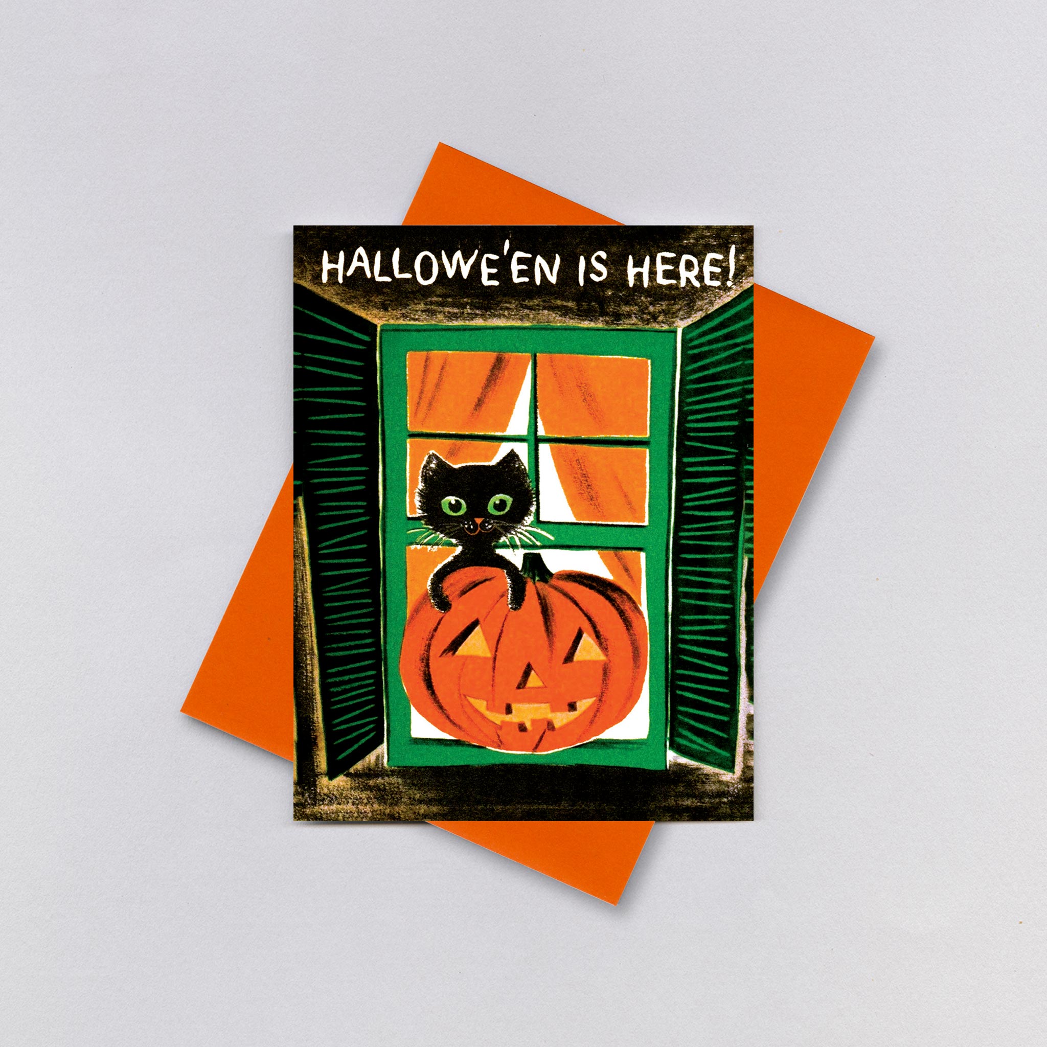 This mid-century reproduction retains its original, timeless design, and it arrives with a festive orange envelope to complete the holiday spirit. Share the spookiness of the season with this delightful card! See this image in a boxed greeting card set.