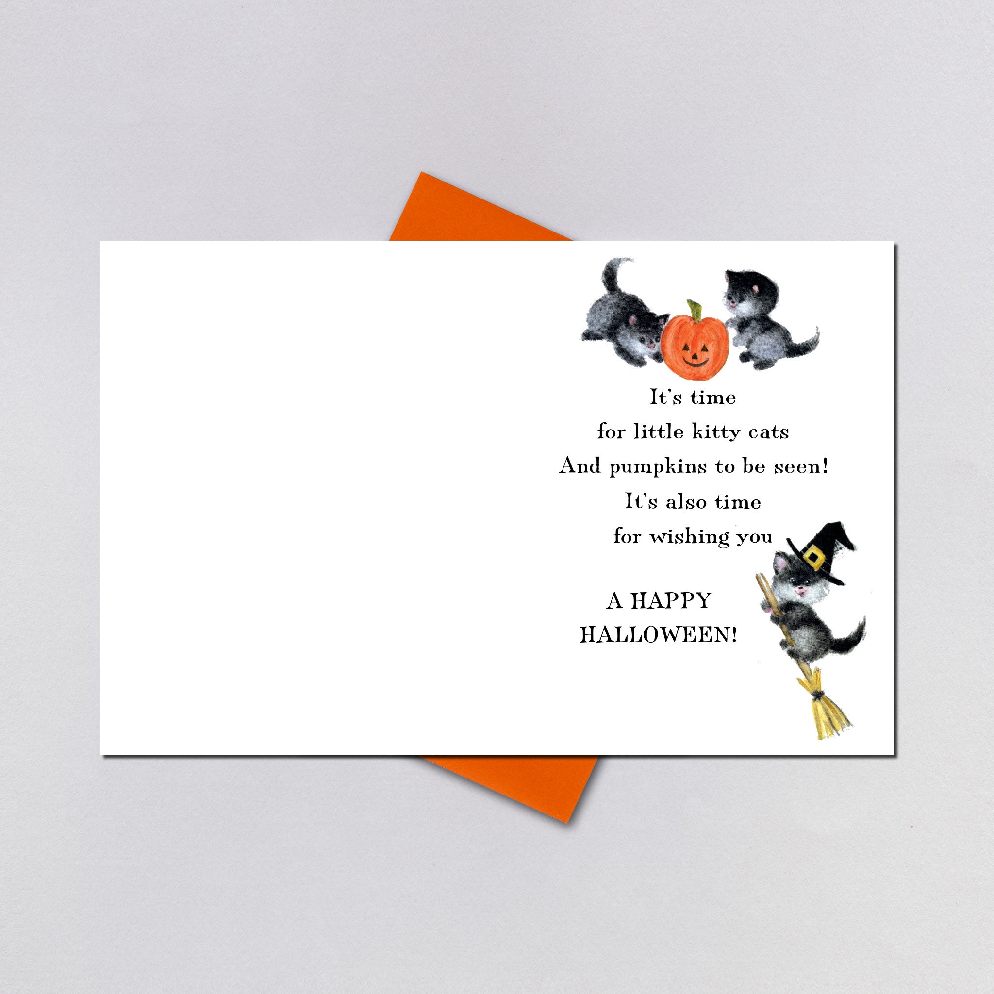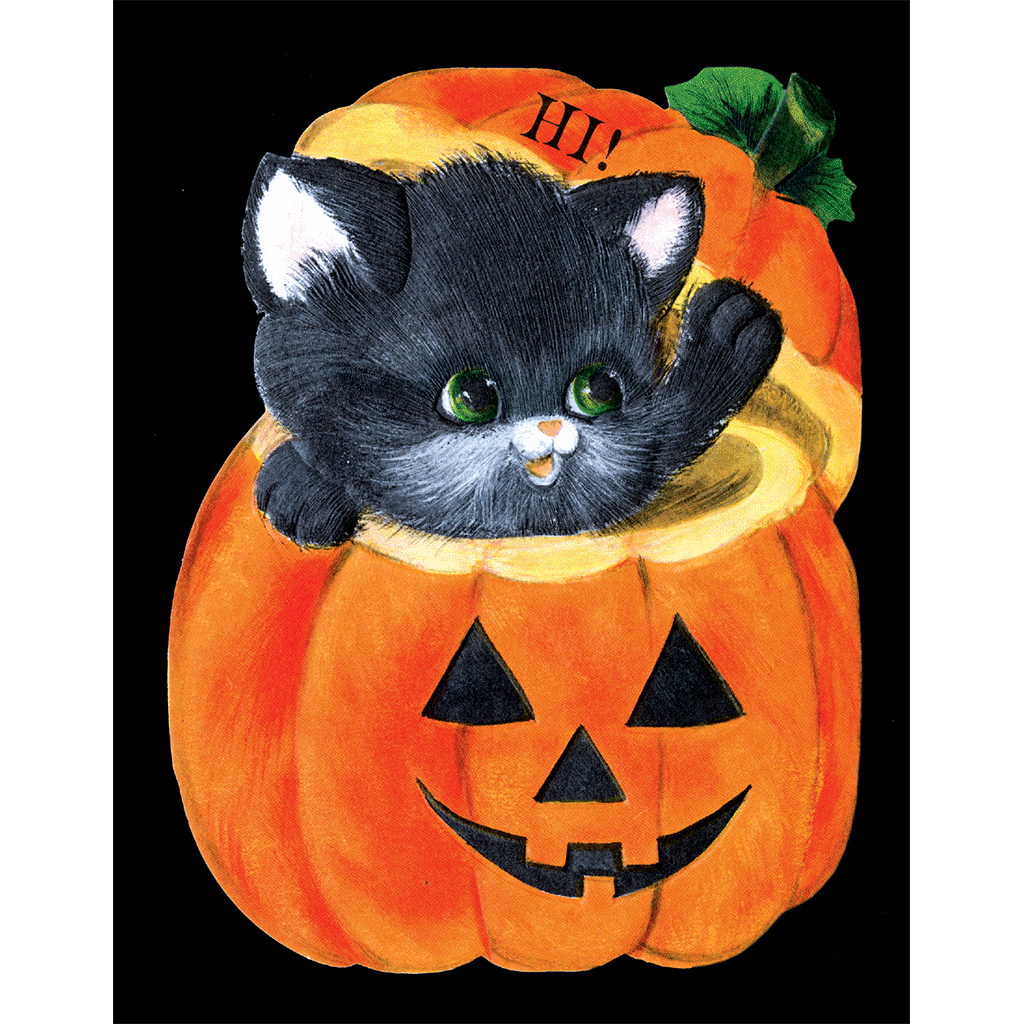 INSIDE GREETING: It’s time for little kitty cats, And pumpkins to be seen! It’s also time for wishing you A HAPPY HALLOWEEN!