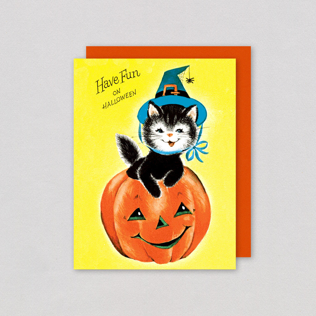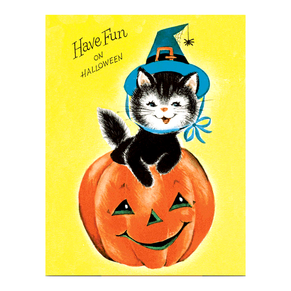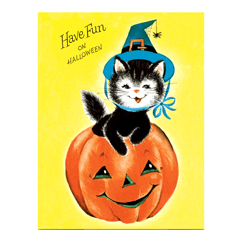 This is just one of our many reproductions of mid-century Halloween cards, known for their kitschy, punny, and endearingly cute designs that never veer into the realm of scariness. We are thrilled to continue offering these delightful cards to a new generation of recipients. Complete with an orange envelope, receiving one of these in your mailbox is undeniably a treat! See this image as a single card!