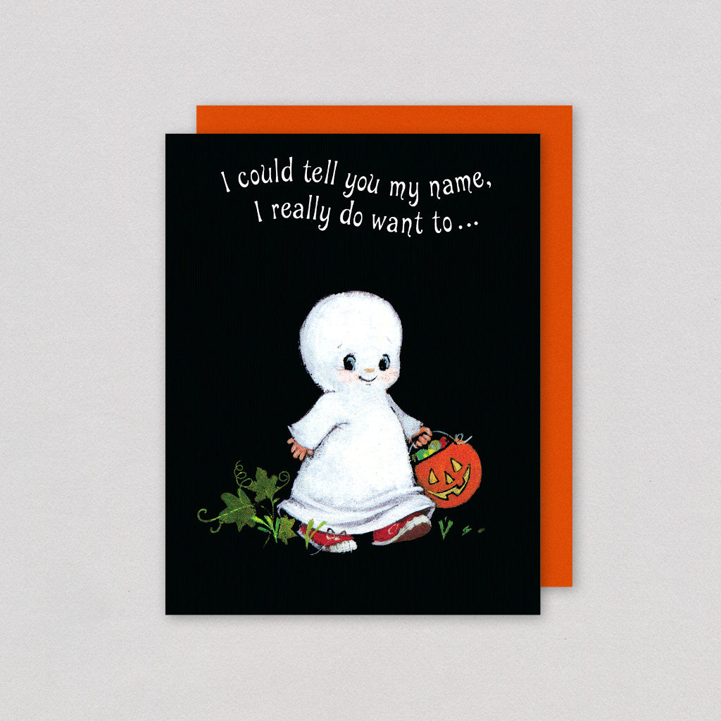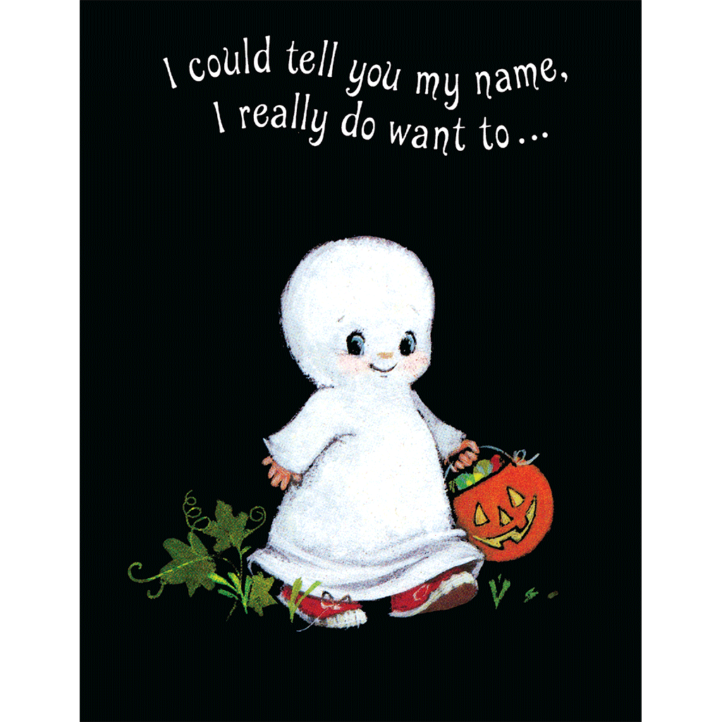 This is just one of our many reproductions of mid-century Halloween cards, known for their kitschy, punny, and endearingly cute designs that never veer into the realm of scariness. We are thrilled to continue offering these delightful cards to a new generation of recipients. Complete with an orange envelope, receiving one of these in your mailbox is undeniably a treat!  See this image as a single card!