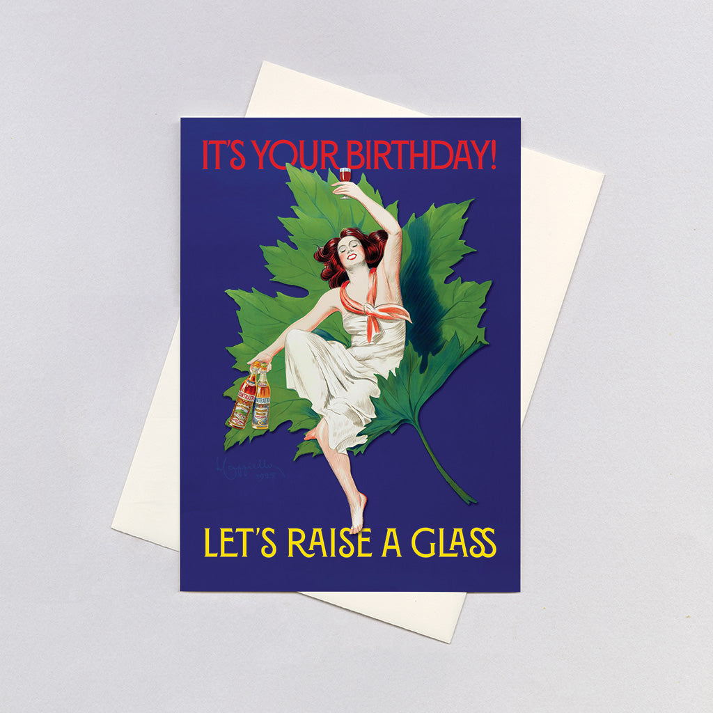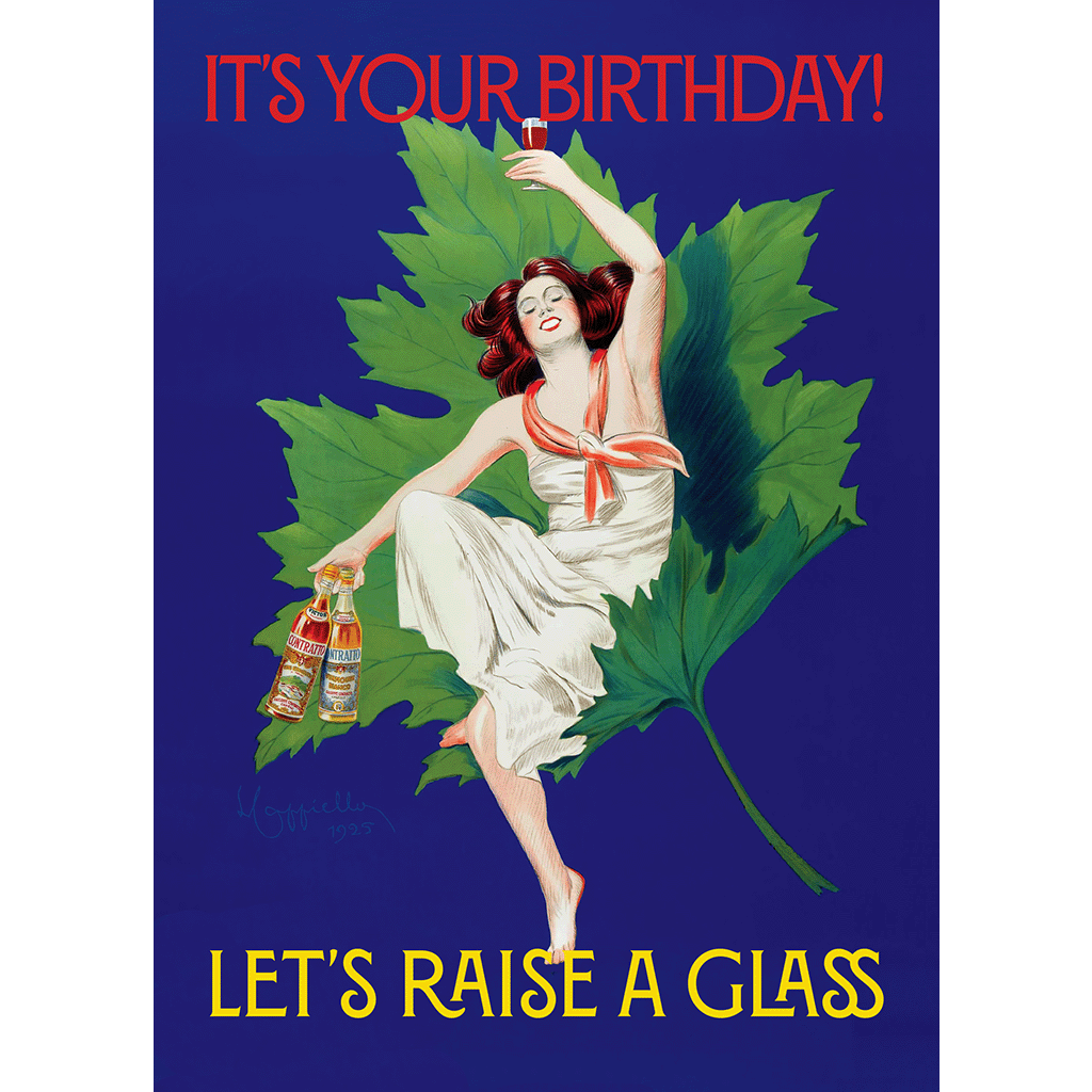 This beautiful card features an illustration by the great Leonetto Cappiello, the master of early 20th-century poster art. A woman lounges elegantly in a grape leaf, two bottles in one hand and a glass of wine raised in the other. The greeting is simple and irresistible: "IT'S YOUR BIRTHDAY! LET'S RAISE A GLASS."