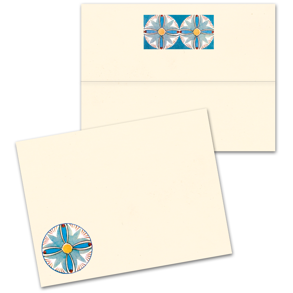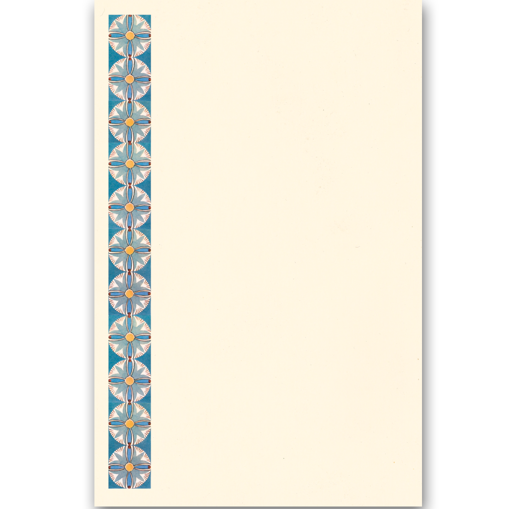 This exquisite Egyptian Lotus letter writing set features the remarkable decorative traditions of ancient Egypt. The elegant lotus motifs showcase the sophisticated aesthetic sensibilities of Egyptian artists, who created endlessly varied patterns using simple repeated forms within geometric networks. These particular designs demonstrate mastery of color - bright blues and yellows offset with subtle pink shades.