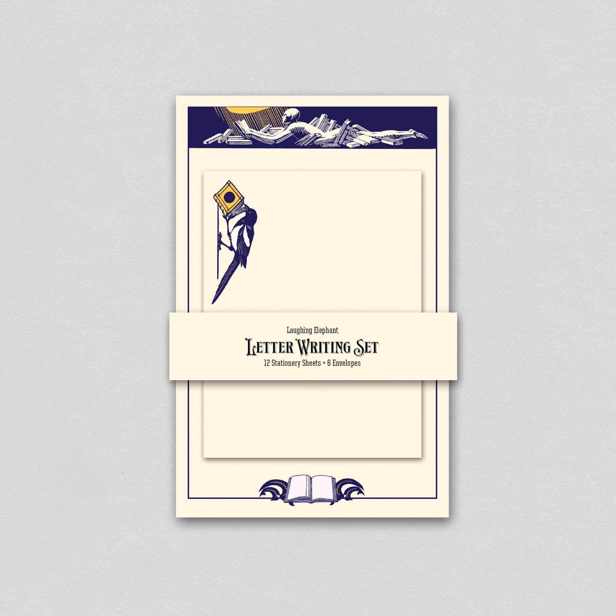 This striking Reader With a Light letter writing set features elegant Art Deco illustrations from a 1929 Woman's Home Companion article about forming your own book club. The stationery sheets showcase a stylized figure reading amidst a pile of books, bathed in sunlight, while the envelopes feature a charming bird opening a book with its beak - a delightful touch of whimsy alongside the sophisticated design.