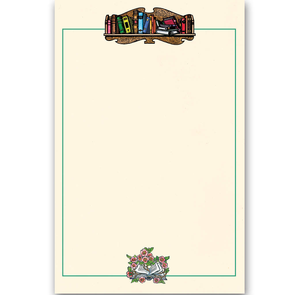 This charming Shelf of Books letter writing set features delightful motifs drawn from a 1920s printer's type catalog, celebrating the timeless beauty of books and reading. The stationery sheets showcase a colorful shelf of books and an open volume nestled in a bed of roses, while the envelopes feature an elegant still life of a book, vine, and candle - evoking the quiet pleasure of reading by candlelight.