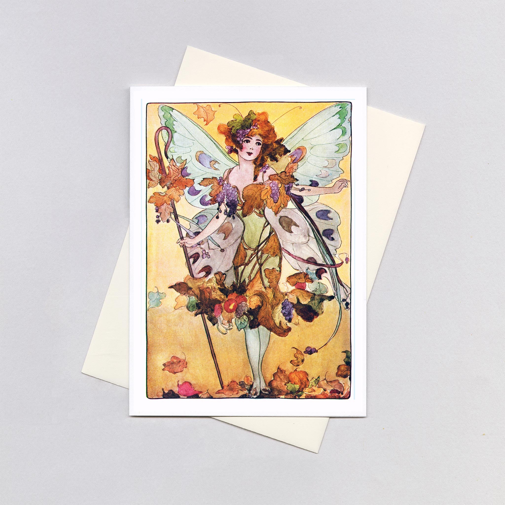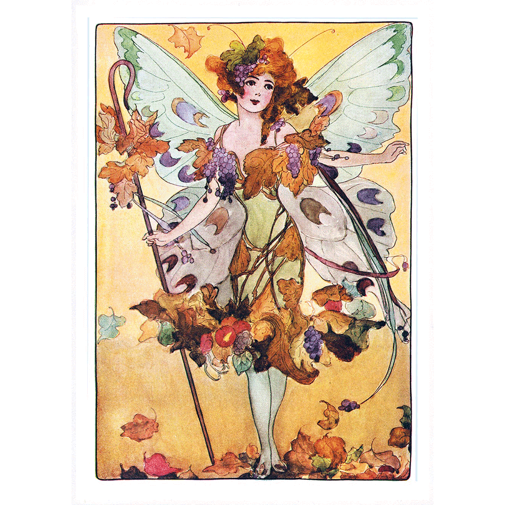 This russet-haired fairy embodies the essence of autumn. Her curly copper hair, adorned with bunches of grapes, frames a beautiful face. Draped in fallen leaves in rich, earthy tones that perfectly complement her delicate pastel wings, this fairy is the picture of seasonal bounty. Gentle winds swirl the leaves around her, giving this image a sense of movement and vibrant energy.