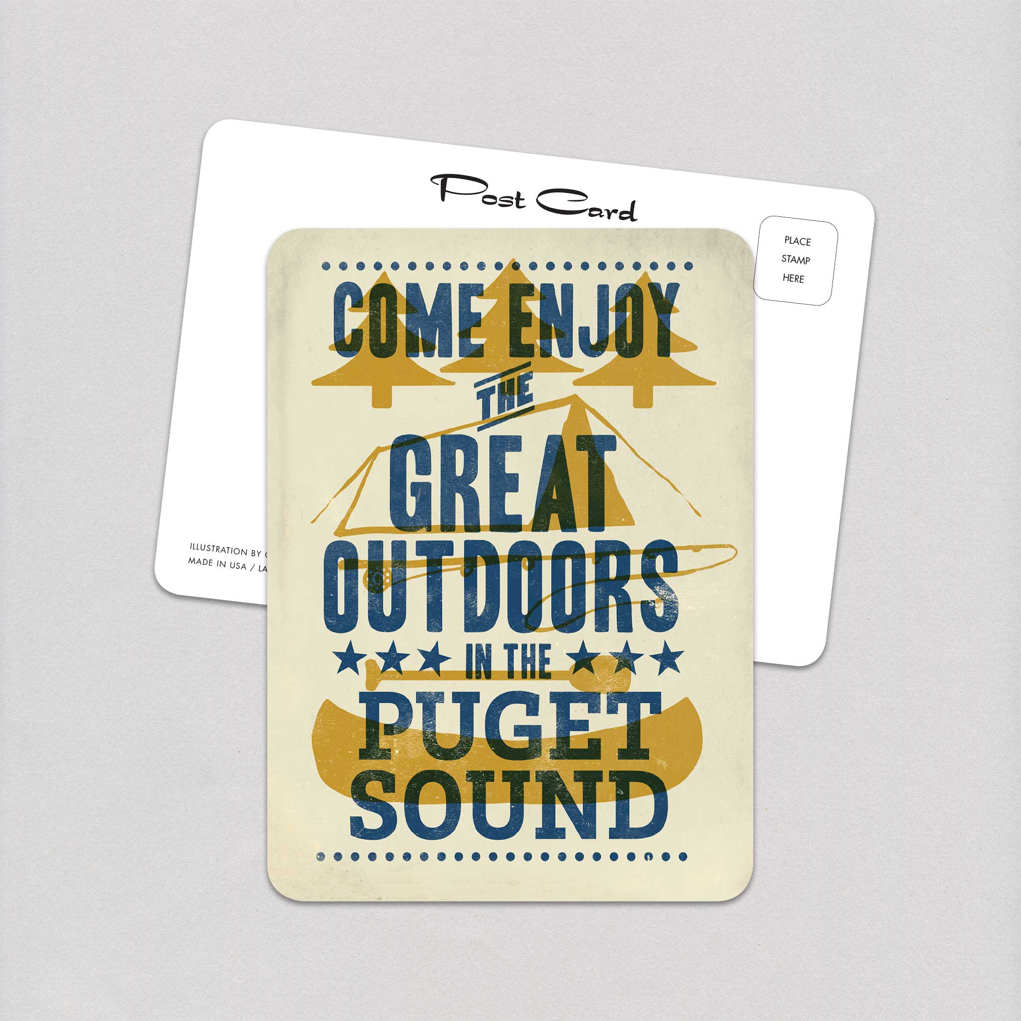 This creative postcard captures the essence of outdoor adventure in the Pacific Northwest. Featuring the message "Come Enjoy the Great Outdoors in the Puget Sound," it highlights the region's abundant recreational opportunities.