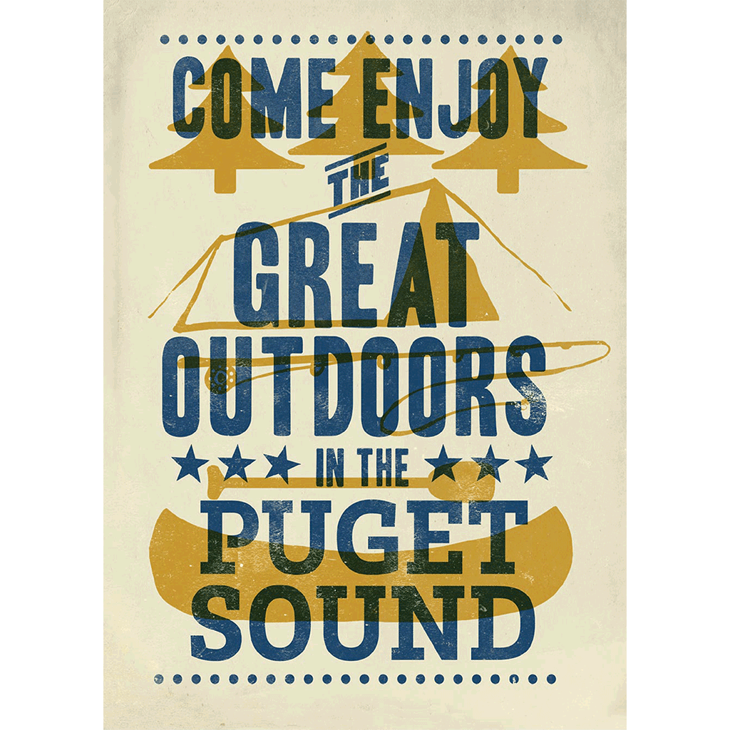 The illustration showcases classic elements of the Puget Sound experience: a canoe ready for exploring pristine waterways, towering pine trees representing the area's forests, and a welcoming tent suggesting the perfect camping getaway among Washington's natural splendor.