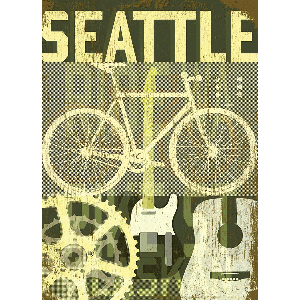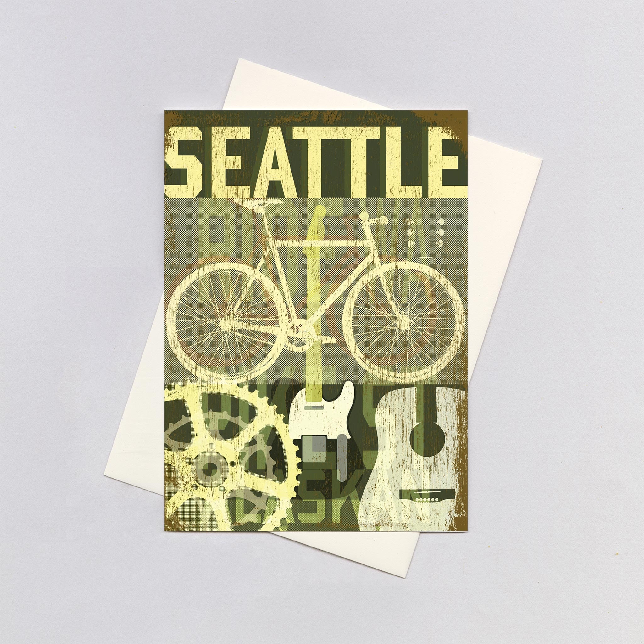 This distinctive card captures Seattle's unique cultural blend of independent music and environmental living. Featuring the city's name alongside illustrations of bicycles and guitars against a grungy green backdrop, it celebrates the revolutionary music scene and commitment to sustainable urban transportation that are strong symbols of Seattle.