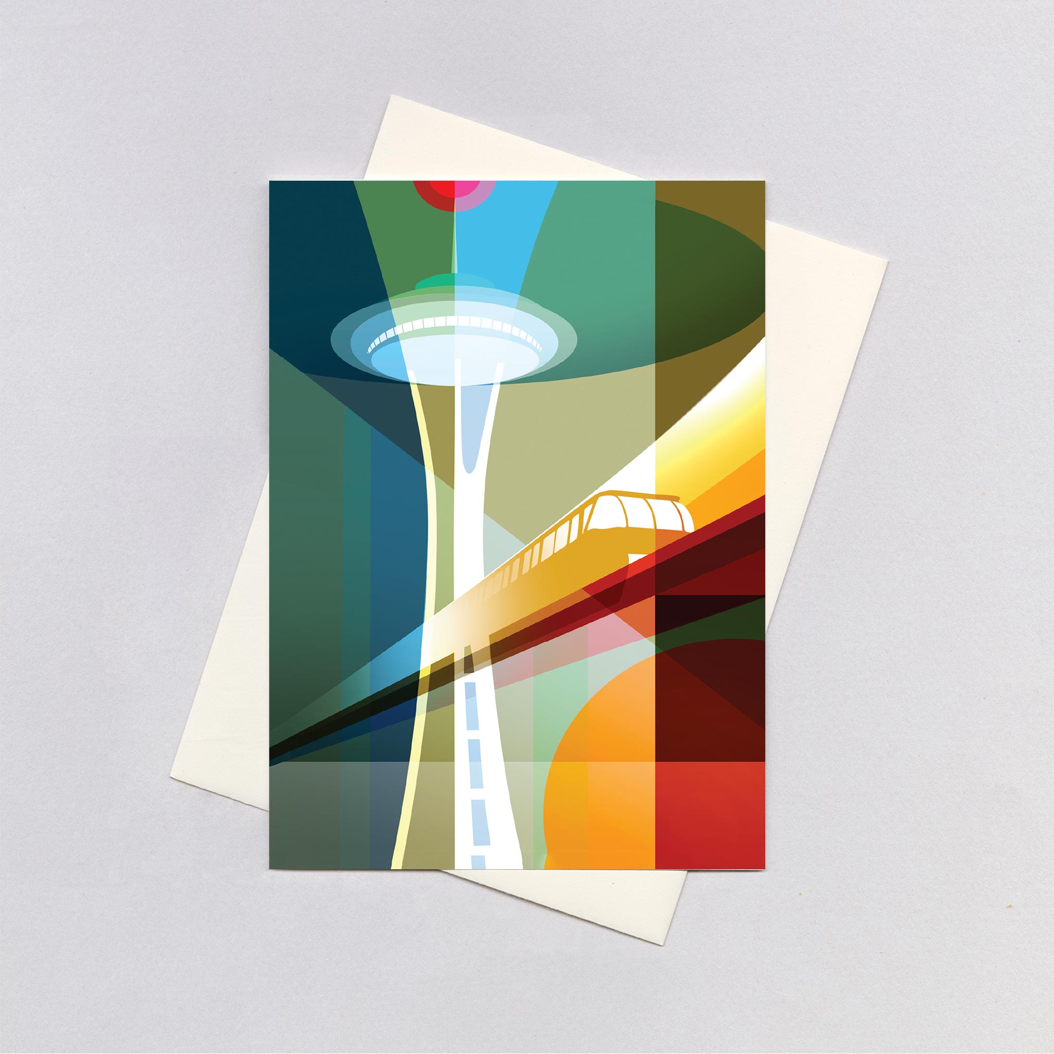 This striking card celebrates Seattle's space-age identity. Featuring stylized illustrations of the iconic Space Needle and Monorail, it captures the optimistic futurism that defined the 1962 World's Fair and continues to shape the city's character.