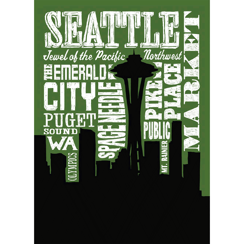The card incorporates iconic Seattle elements in text form, including Pike Place Market, the Olympics, Mt. Rainier, the Space Needle, and Seattle’s “Emerald City” nickname. Together, these elements create a love letter to Seattle that captures its urban energy, natural splendor, and distinctive character all at once.