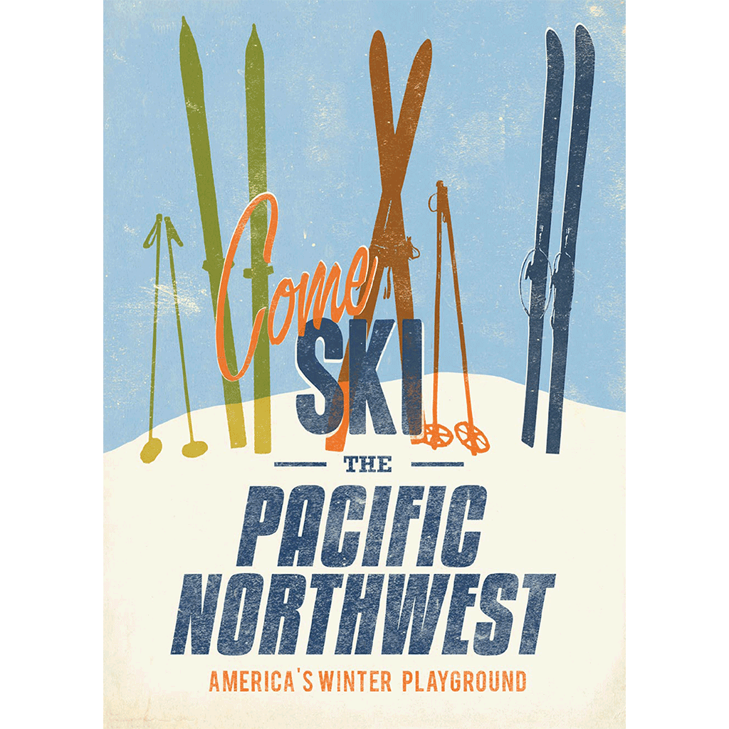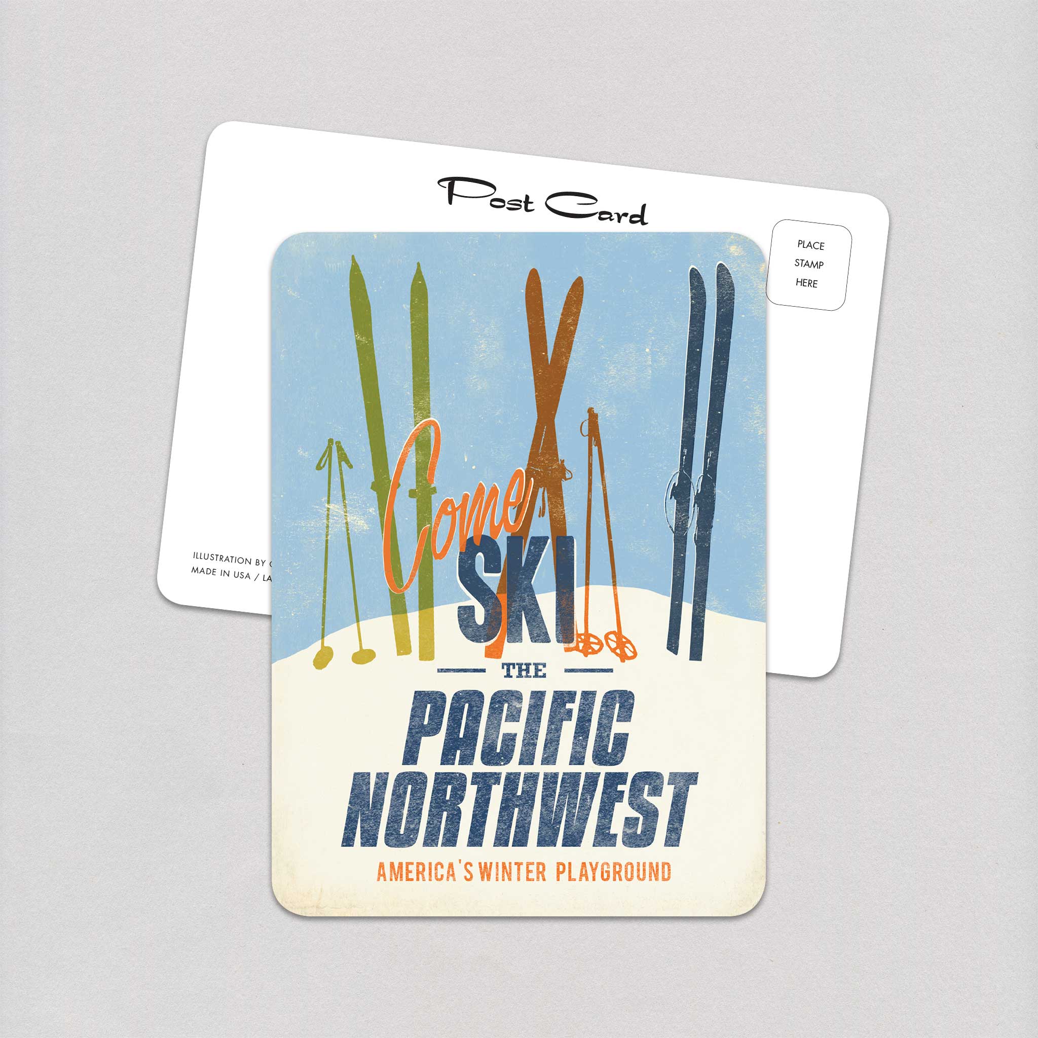 This vintage-inspired postcard celebrates the ski culture of the Pacific Northwest. Featuring the inviting message "Come Ski the Pacific Northwest America's Winter Playground" alongside skis and poles planted in snow, it evokes the golden era of winter sports tourism.