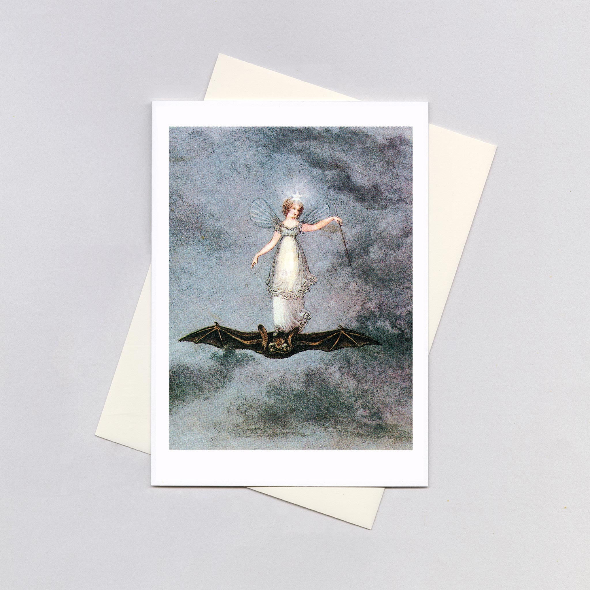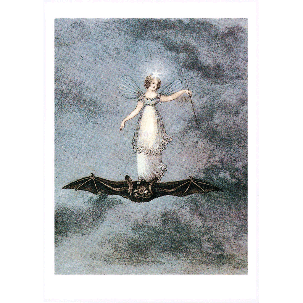 A vision of Victorian fantasy unfolds in this ethereal illustration. Draped in a gossamer white gown, with beautiful, delicate, translucent wings, a delightfully confident fairy stands poised atop a bat flying through the night. Her starry headdress gleams, casting a beautiful soft light.