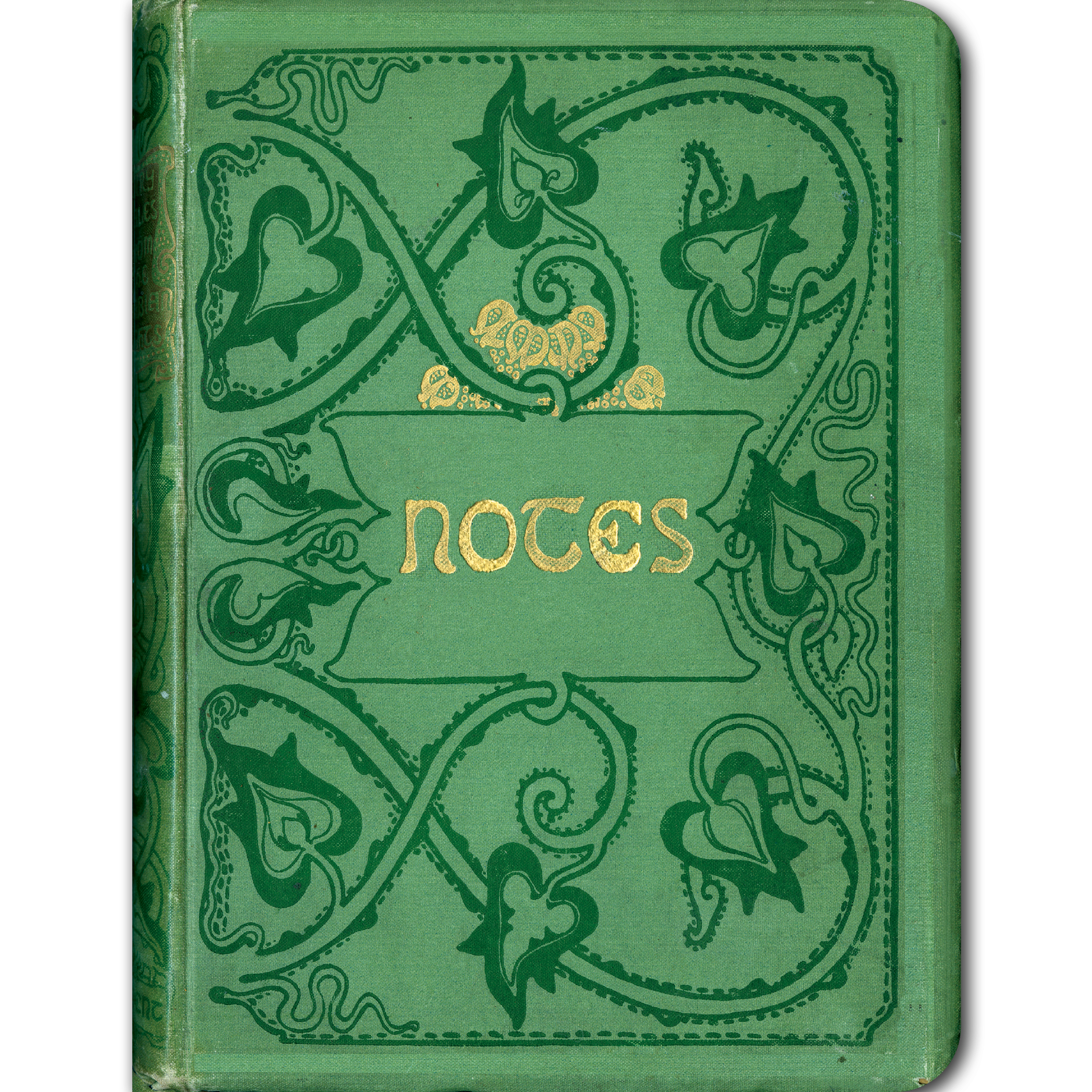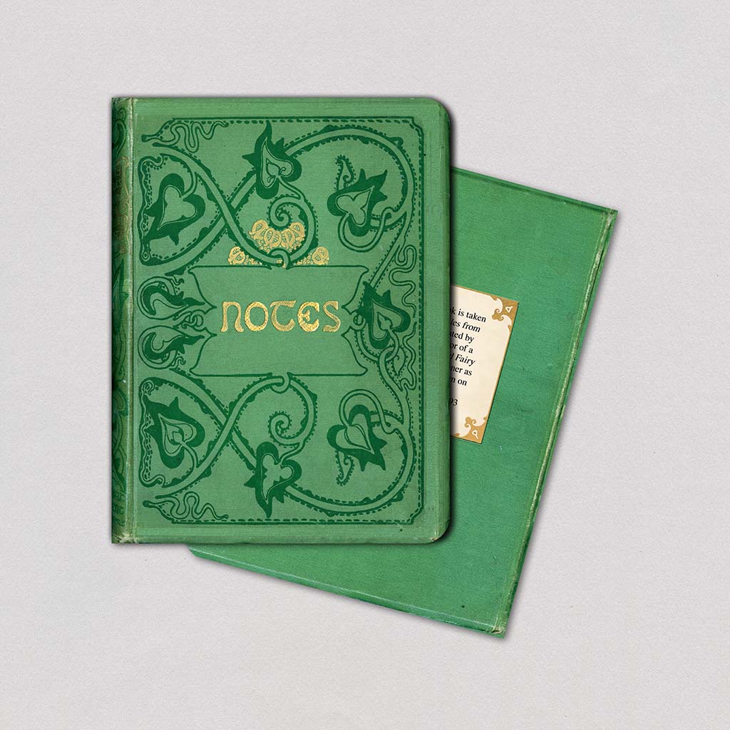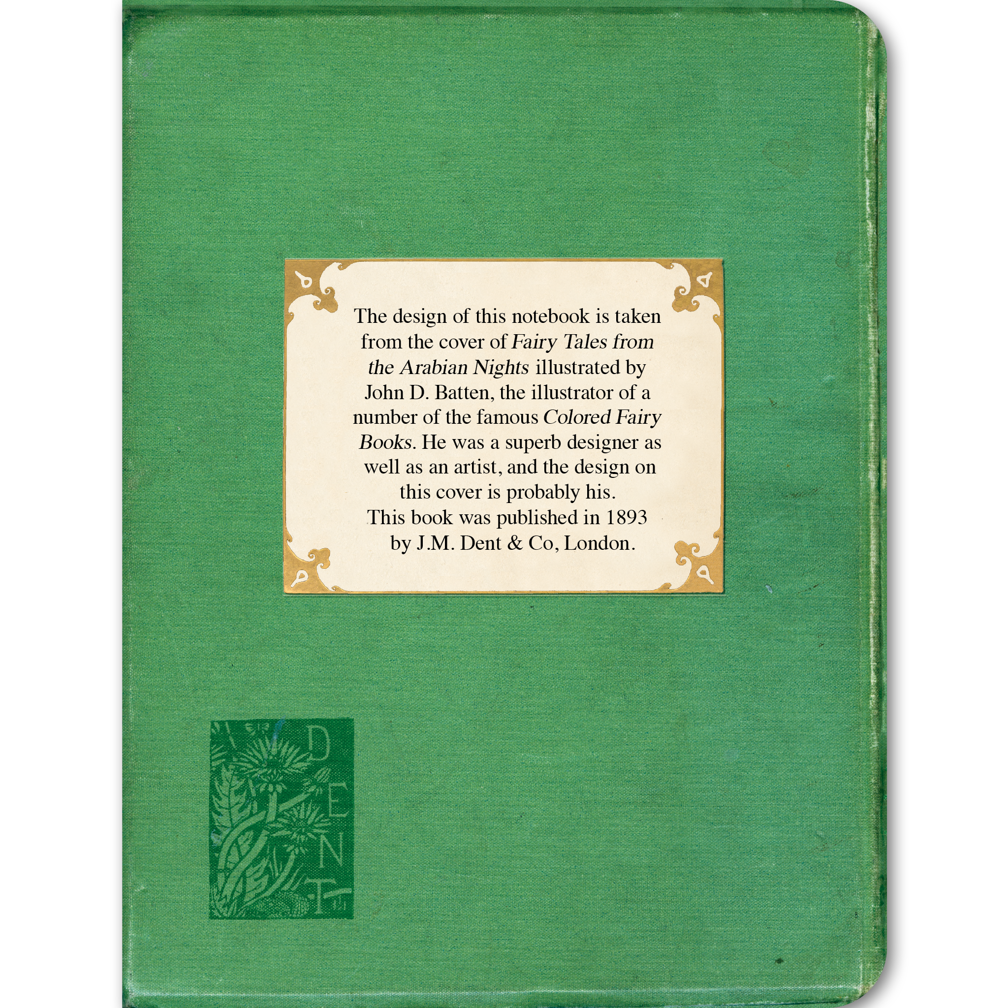 The design of this vintage notebook is taken from the cover of Fairy Tales From The Arabian Nights, illustrated by John D. Batten — the illustrator of a number of the famous Colored Fairy Books. He was a superb designer as well as an artist, and the design on this cover is probably his. This book was published in 1893 by J.M. Dent & Co., London.