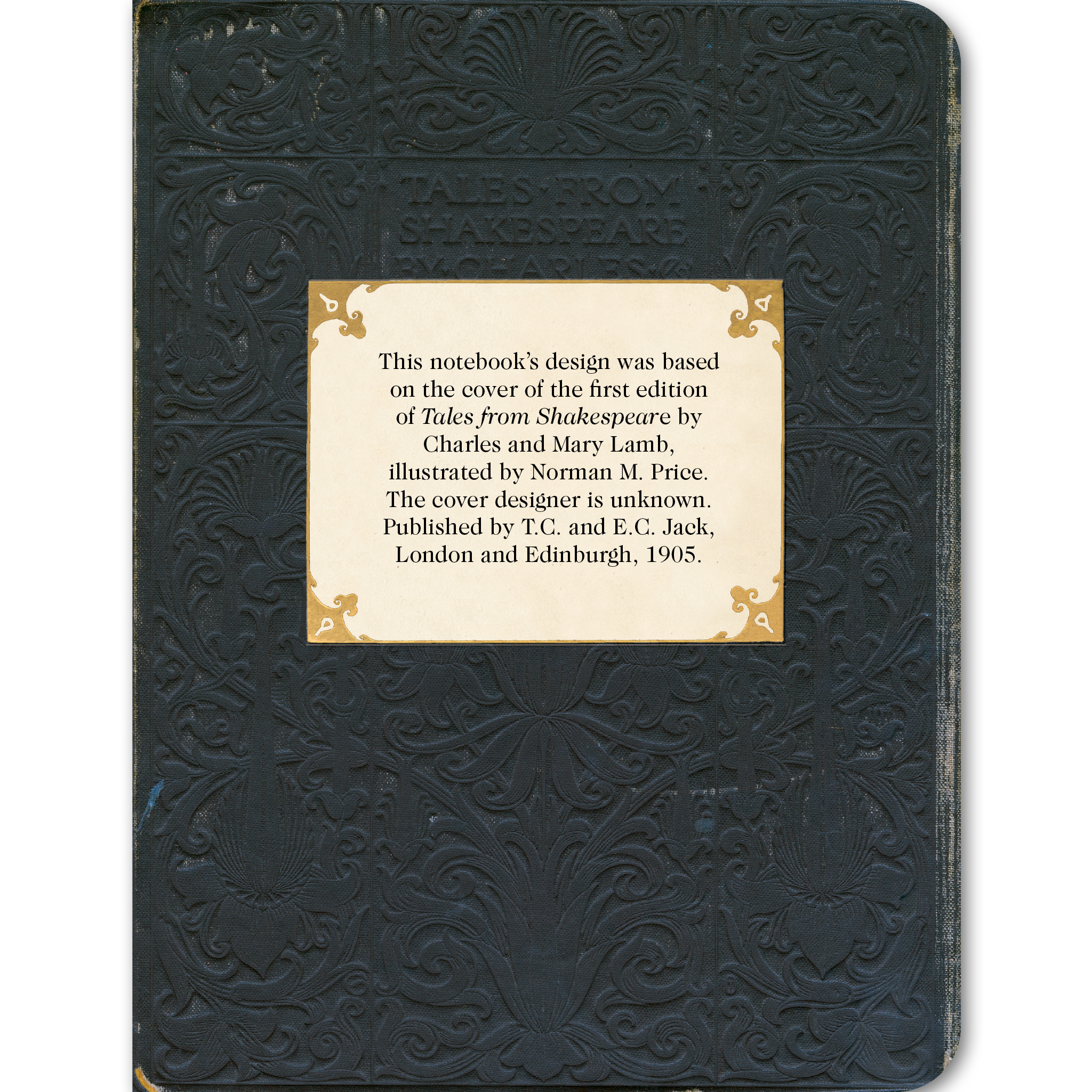 This vintage notebook’s design was based on the cover of the first edition of Tales From Shakespeare by Charles and Mary Lamb, illustrated by Norman M. Price. The cover designer is unknown. Published by T.C. and E.C. Jack, London and Edinburgh, 1905.