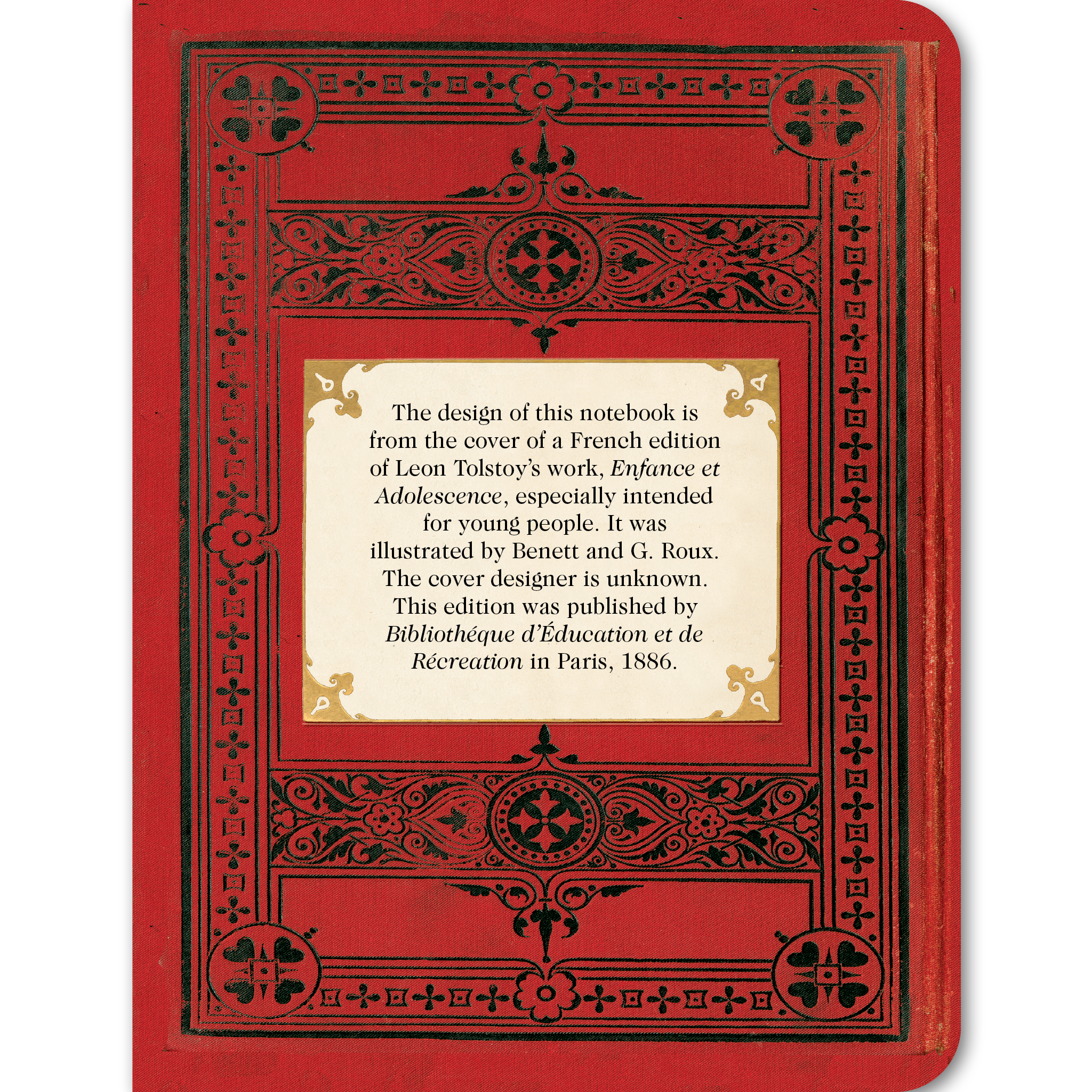 The design of this vintage notebook is taken from the cover of a French edition of Leon Tolstoy’s work, Enfance Et Adolescence, especially intended for young people. It was illustrated by Benett and G. Roux, but the cover designer is unknown. This edition was published by Bibliotheque D’education Et De Recreation in Paris, 1886.