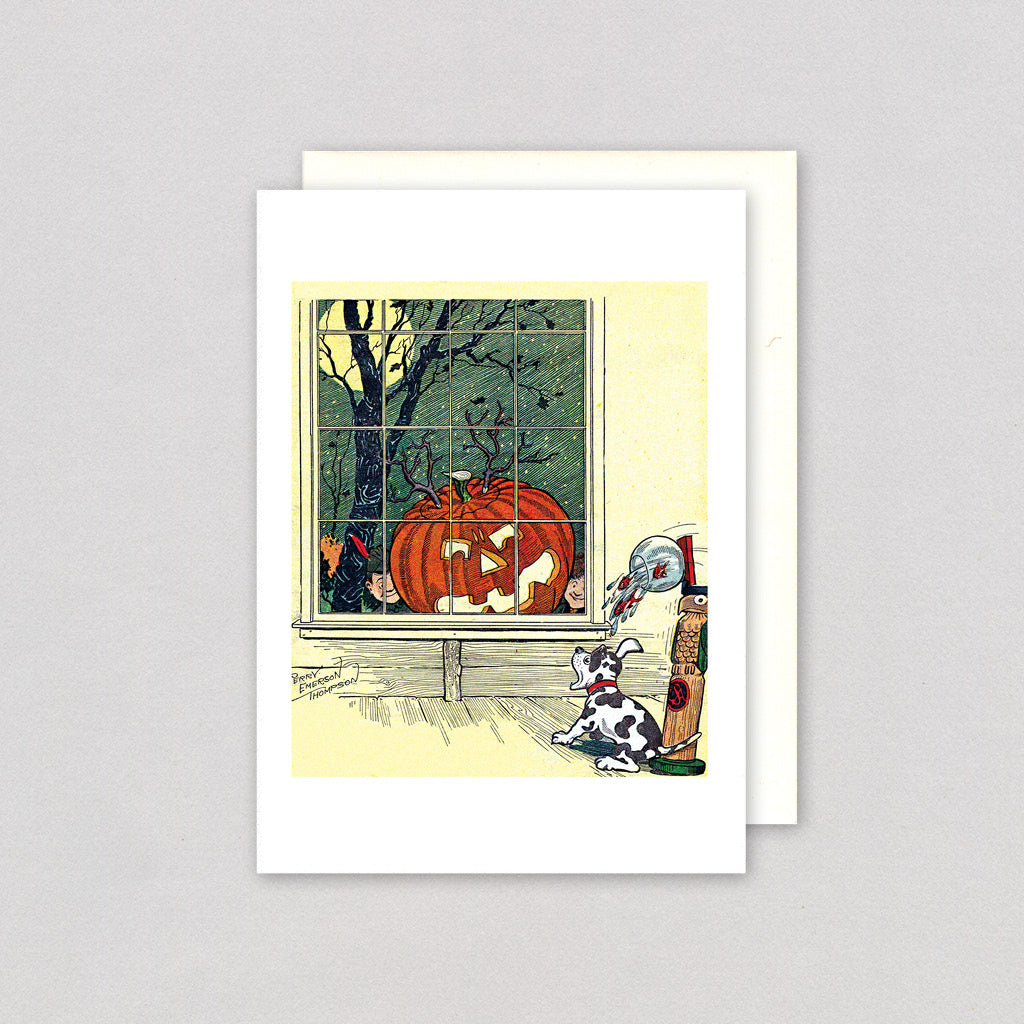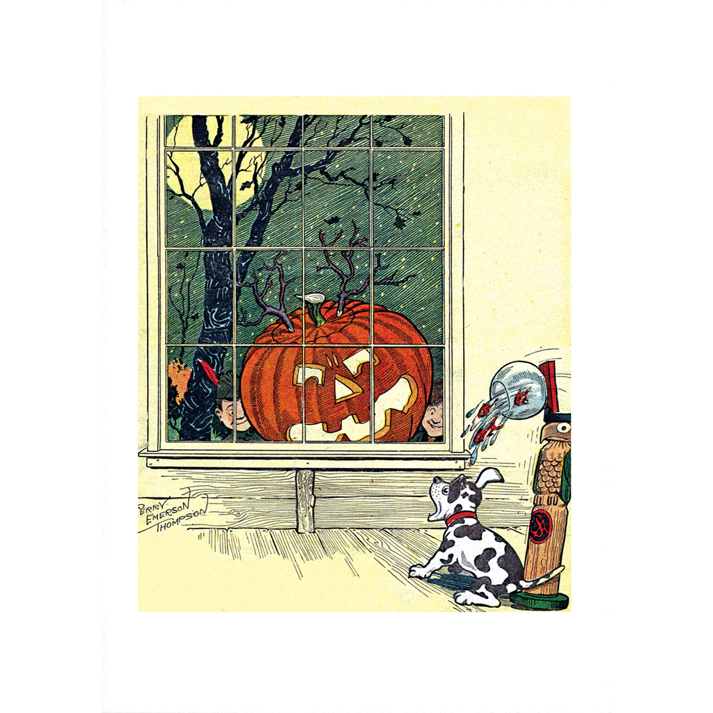 Poor doggy! But also poor fishes!! This artwork is just one of the many spooky delights found in our Halloween catalog, where mischievous children are depicted scaring both people and animals at the window with a glowing jack-o'-lantern. It vividly captures the historical essence of the "trick" part of "trick or treat," reminding us of the playful, mischievous spirit that has always been a part of Halloween celebrations.