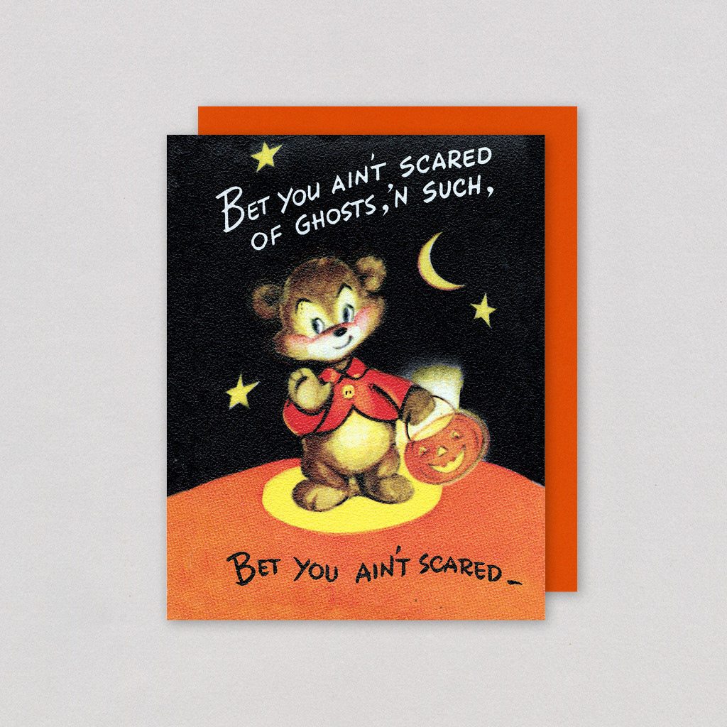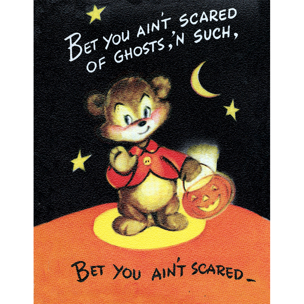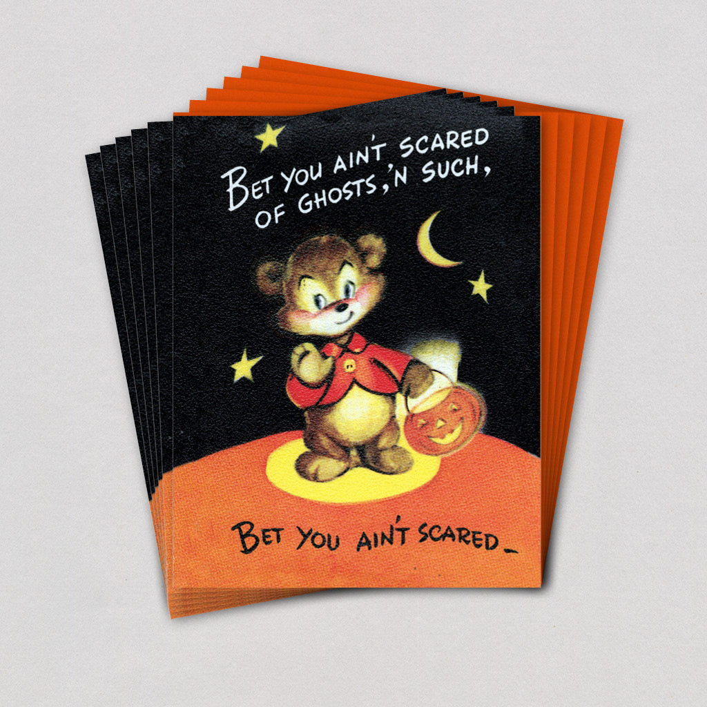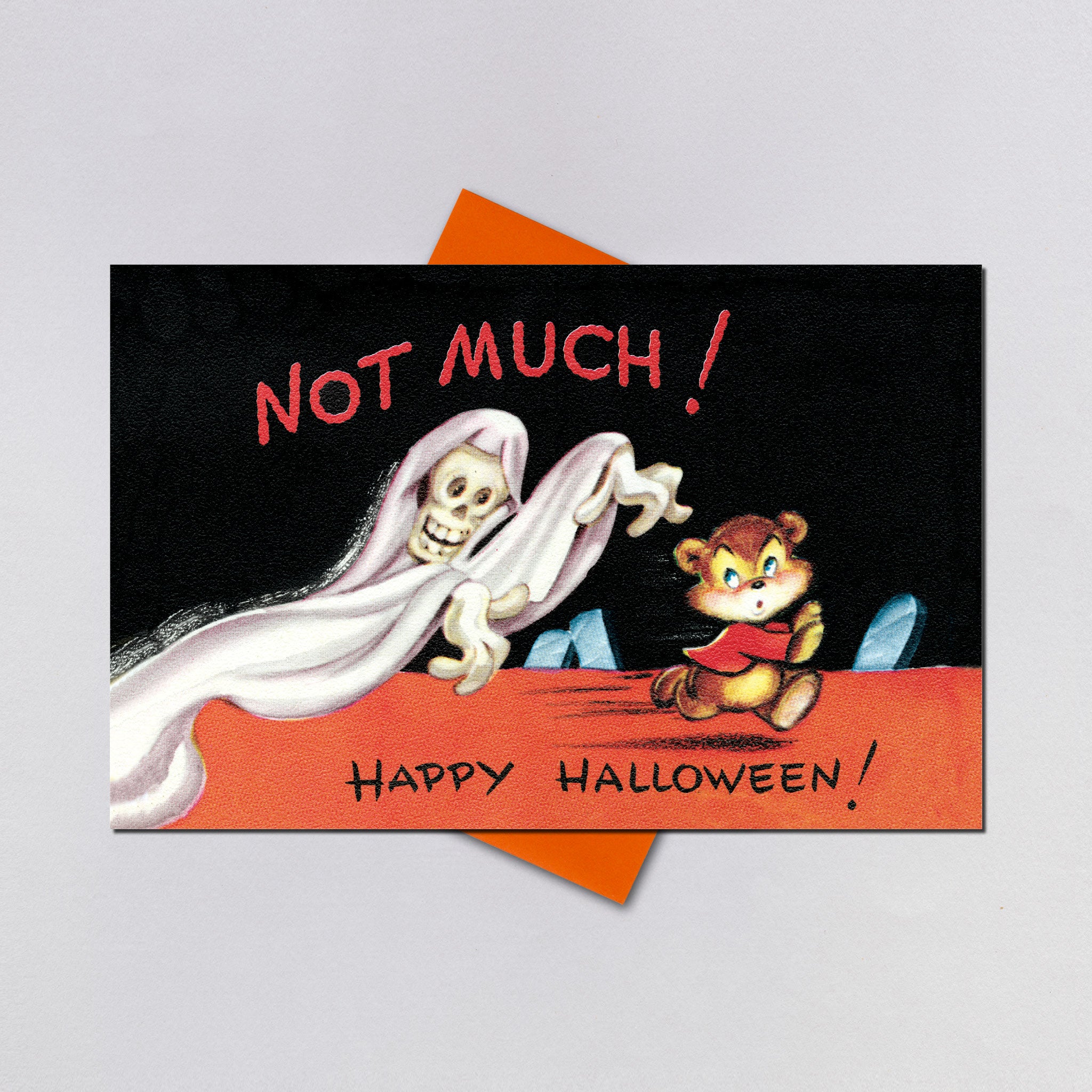 This is just one of our many reproductions of mid-century Halloween cards, known for their kitschy, punny, and endearingly cute designs that never veer into the realm of scariness. We are thrilled to continue offering these delightful cards to a new generation of recipients. Complete with an orange envelope, receiving one of these in your mailbox is undeniably a treat! See this image as a single card!