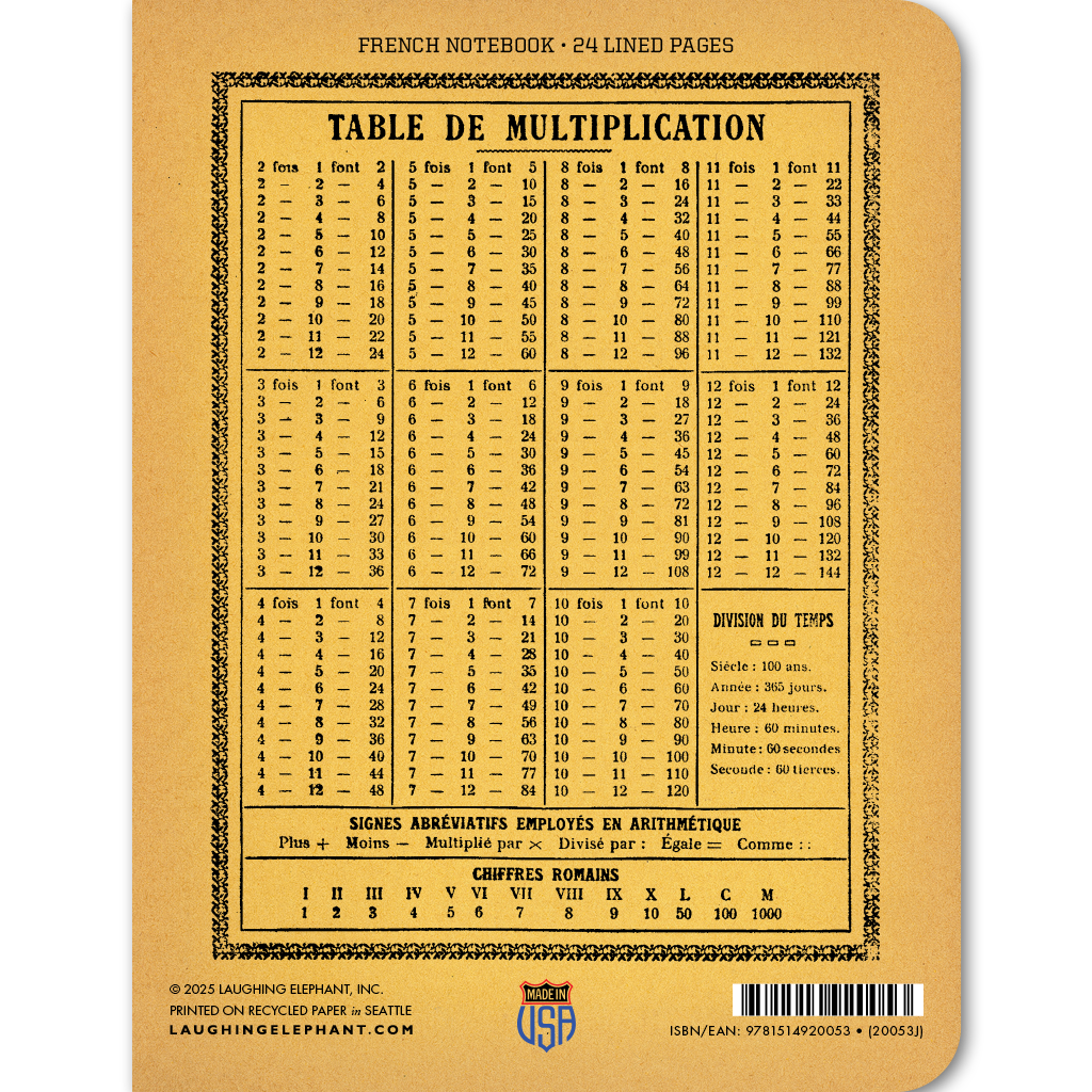 Designed initially for French schoolchildren of the past, it now serves perfectly for modern jotting or list-making. The back cover includes vintage-style information, such as multiplication and measurement tables.