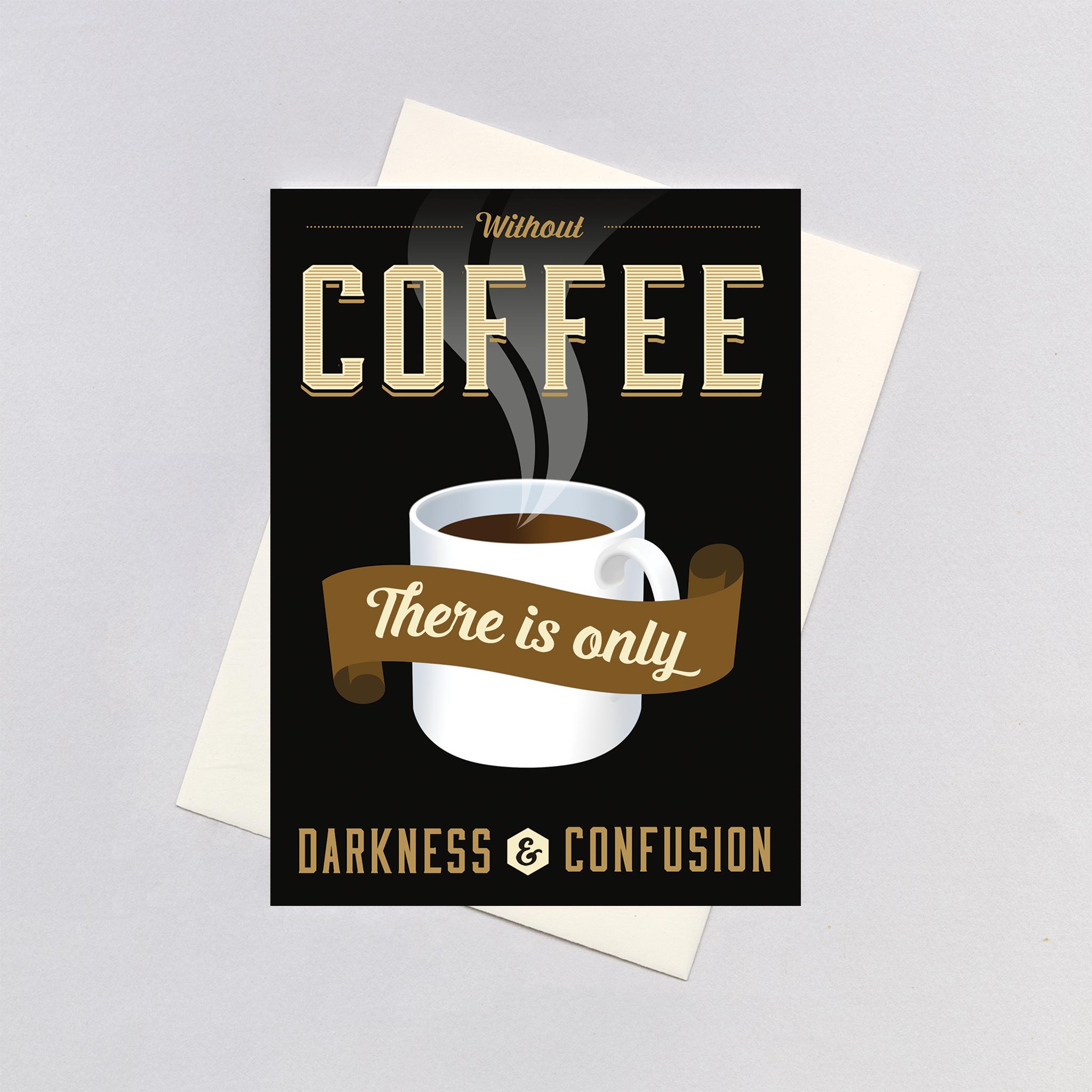 For those who recognize coffee as the essential dividing line between chaos and clarity, this card speaks a profound truth. Featuring a darkly humorous phrase alongside a steaming mug, this card acknowledges the very real struggle of the pre-caffeinated mind. The design contrasts shadowy elements representing the confused, coffee-less state against the warm, inviting glow emanating from the mug. Steam rises from the cup in delicate wisps, suggesting the aromatic promise of enlightenment that only coffee can deliver.